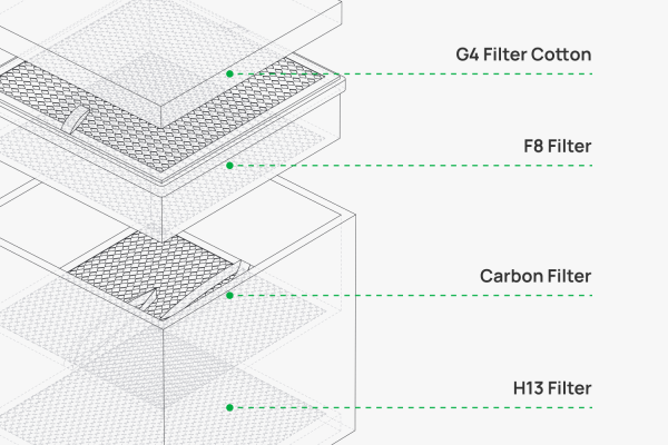 • Effektive Filterung von Rauch, Gerüchen und schädlichen Partikeln