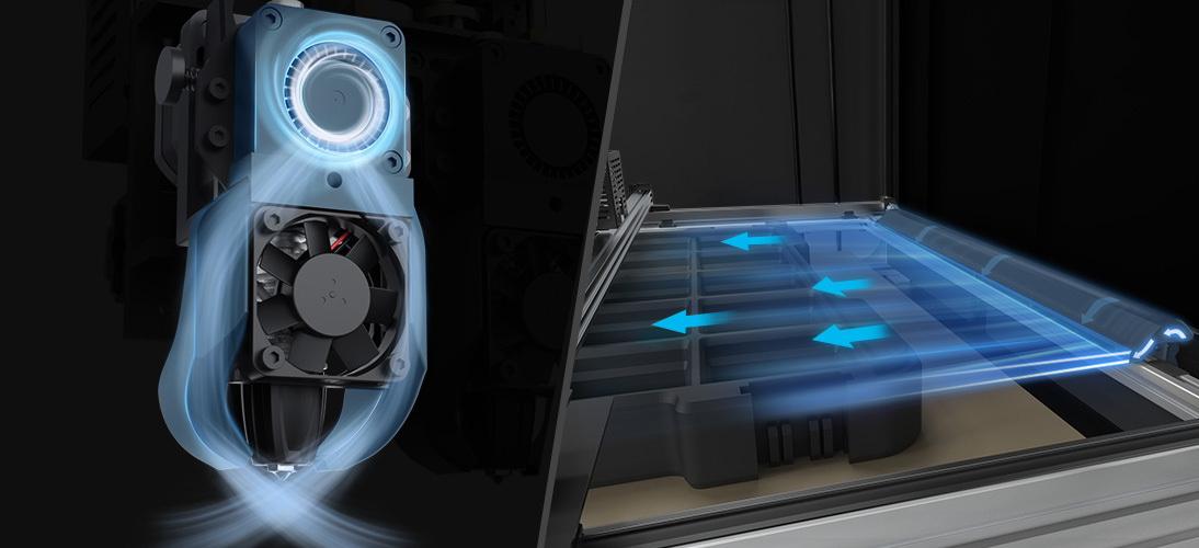 Das duale Kühlsystem hebt die Modellkühlung auf eine neue Stufe. Das anaerodynamische Luftkanaldesign bläst die Modelle mit einem starken, gerichteten Luftstrom an, um die Kühlleistung zu verbessern und perfekte Abdrücke zu erzeugen.