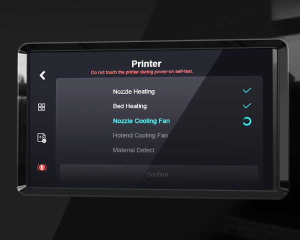 Beim Einschalten kann der Status des Extruders, des Heißbetts, der Kamera, der automatischen Nivellierung, des Lüfters und anderer Komponenten automatisch überprüft werden. Wenn es irgendwelche Anomalien gibt, wird auf dem Bildschirm des Druckers eine Aufforderung zur schnellen und bequemen Bearbeitung angezeigt.
