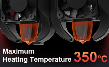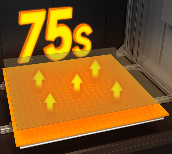 Die Höchsttemperatur des Heizbetts beträgt 110 °C. Das gleichmäßig beheizte Heizbett aus Aluminiumlegierung kann in etwa 75 Sekunden auf 60 °C Celsius erhitzt werden; die Heizgeschwindigkeit bleibt bei 220 V und 110 V unverändert.