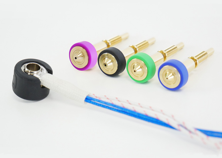 Beim 3D-Druck mit PLA oder PETG reicht der Standard 40 Watt HeaterCore völlig aus, um die maximale Durchflussleistung zu erreichen. Wenn mit Filamenten gearbeitet wird, die höhere Temperaturen benötigen, lohnt es sich die Düse mit einem HeaterCore von 60 Watt zu kombinieren. Der heizt sich wesentlich schneller auf als der Standardheizblock, hat aber einen positiven Temperaturkoeffizient (PTC). Das heißt seine Leistung reduziert sich mit zunehmender Hitze.