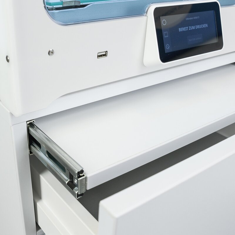 Mit dem Bundle aus Ultimaker S5 3D-Drucker und Maertz Cabinet erhalten Sie eine komplette Stand-Alone Produktionsumgebung, mit der Bauteile auch in höheren Stückzahlen gefertigt werden können. Der Ultimaker S5 bietet mit seinem bewährten Dual-Extruder System und dem verlässlichen und intuitiven Ökosystem eine Lösung für komplexere Bauteile oder Materialien. Durch den passenden Air Manager kann der Bauraum des Druckers geschlossen werden, wodurch technische Filamente beispielsweise mit Faserverstärkung besser druckbar werden. Zusätzlich bietet der Air Manager einen Schutz vor Eingreifen in die Mechanik und filtert die Abluft und ggf. entstehende Emissionen. Mit dem Maertz Cabinet kann der Drucker flexibel bewegt werden und bei Bedarf transportiert werden. Das Gesamtpaket baut damit seinen eigenen Footprint und nimmt keinen Platz auf Tischen, Unterlagen oder Regalen ein.